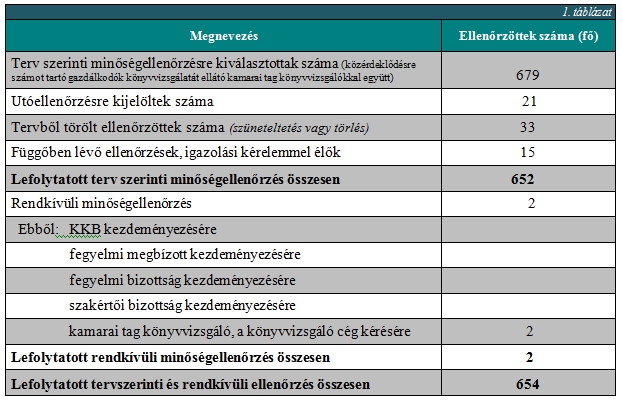 A táblázatból látható, hogy 700 fő (terv szerinti + utóellenőrzés) kamarai tag könyvvizsgáló ellenőrzése szerepelt a bizottság 2012. évi minőségellenőrzési tervében, ebből 652 főnél zárult le a minőségellenőrzés.